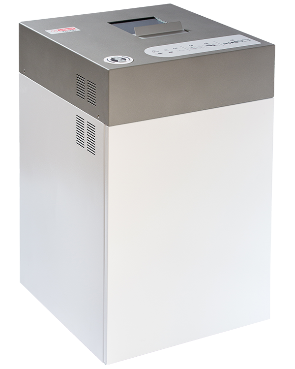 Compact deskside shredder that produces highly secure Level P-4 waste particles.